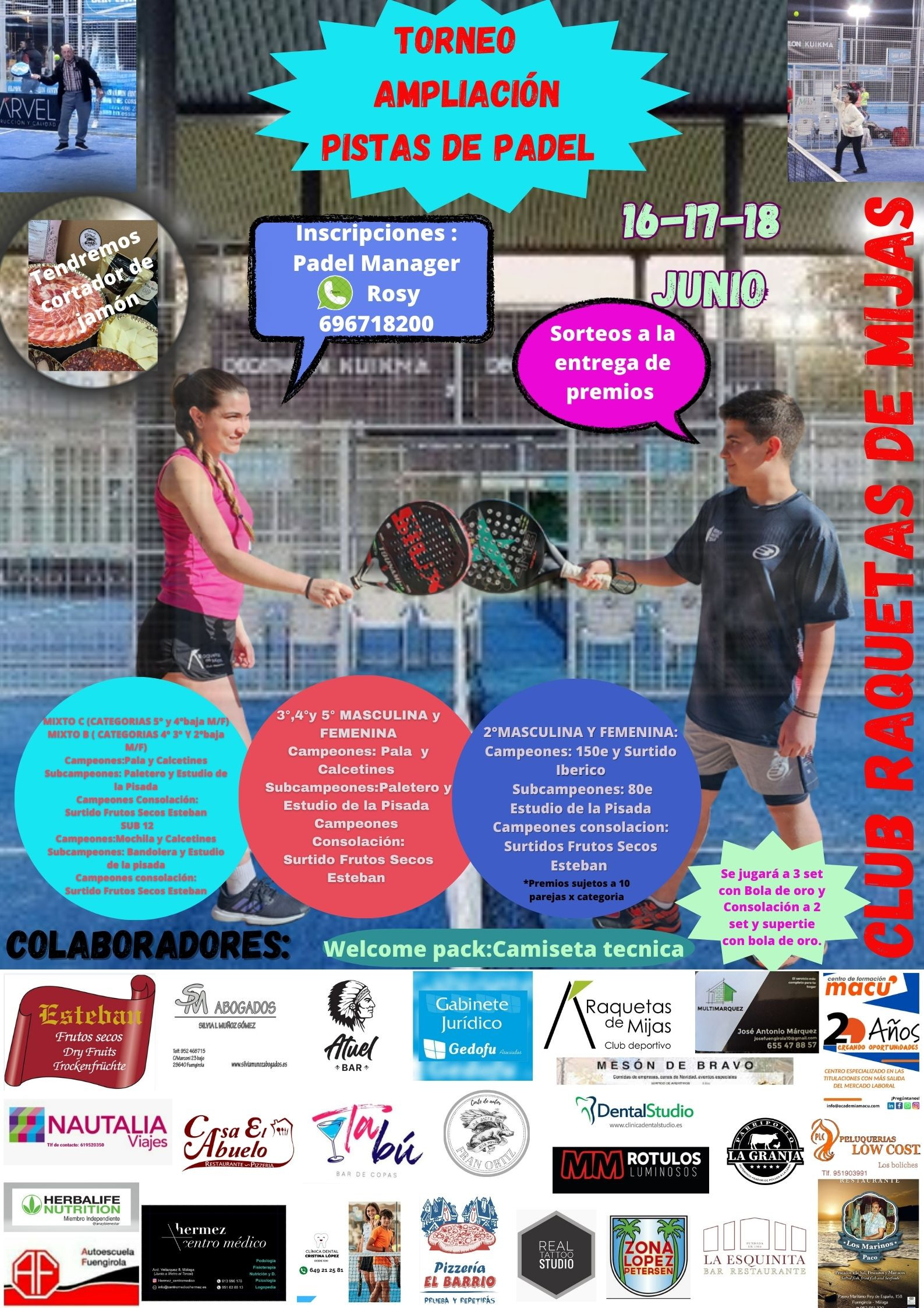 Premios: PRIMERA MASCULINA Campeones:200 Subcampeones:130 SEGUNDA MASCULINA y SEGUNDA FEMENINA Campeones:120e Subcampeones:60e TERCERA CUARTA Y QUINTA MASCULINA Campeones:PALAS Subcampeones:PALETEROS TERCERA CUARTA Y QUINTA FEMENINA Campeonas: PALAS Subcampeonas: PALETEROS MIXTO B Campeones:PALAS Subcampeones:PALETEROS SUB 14 Campeones: Mochilas Subcampeones: Bandolera CAMPEONES CONSOLACION: Surtido frutos secos esteban. PREMIOS SUJETOS A MINIMO 12 PAREJAS POR CATEGORIA. SE JUGARA COMO EL WPT 3 SET CON BOLA DE ORO Y EN CONSOLACION A SUPERTIEBREAK A 9 JUEGOS SORTEOS EN LA ENTREGA DE PREMIOS. Contacto: Rosy 696718200